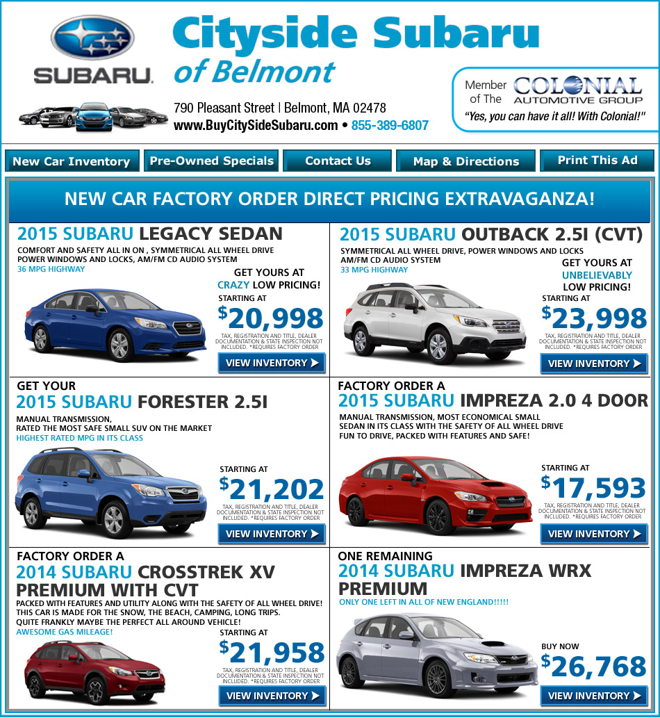 Cityside Subaru Cityside subaru from mapcarta, the open map. Get directions, reviews and information for cityside subaru in belmont, ma. Visit the dealership for sales, parts, or service today! Cityside subaru access your saved cars you've successfully logged in!