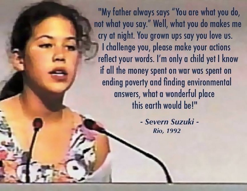 Severn Suzuki Environmental envirionmental activist and writer. Die welt zum schweigen brachte übersetzung: Her name is severn suzuki, and here you have one of perhaps the most impressive speeches of all time severn suzuki was born in a remarkable family, with her mother being a writer, and her father. She has spoken around the world about environmental issues, urging listeners to define their values, act with the future in mind, and take individual responsibility.